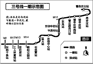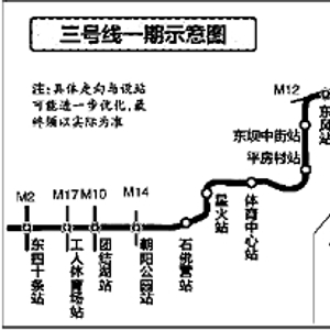 根据此前环评公告信息显示,3号线共设车站15座,分别为东四十条站、工人体育场站、团结湖站、朝阳公园站、石佛营站、星火站、体育中心站、平房村站、东坝中街站、东风站、管庄路西口站、楼辛庄桥西站、楼辛庄站、高辛庄站和曹各庄北站。其中,东四十条站、工人体育场站、团结湖站、朝阳公园站、东风站为换乘车站,可分别与地铁2号线、17号线、10号线、14号线以及12号线实现换乘。