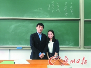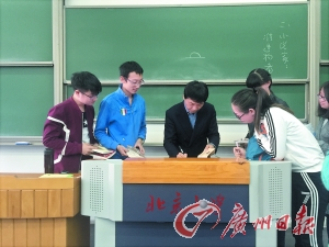 课间,不少同学上台请他签名,他均一一满足。由于他已过度劳累,我实在不好意思提采访要求,只轻轻递上一张名片,请他在书上签名。但曹老师见我从广州过来,主动腾出时间接受了我的采访。我知道,这是他做人的细致和周到。