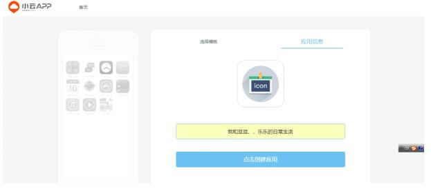 第四步、选完了模板,随即弹出了一个为APP取名字的页面。虽然是为“二哈”做的APP,但是可不能真叫二哈啊。思索良久,输入了我家狗和猫的名字:“我和豆豆、乐乐”的日常生活”,然后点下面的“点击创建应用”按钮。