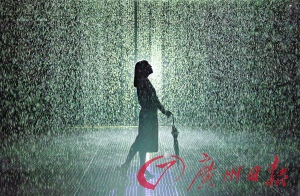 据介绍,这是“雨境空间艺术展”首次亮相广州。在一个200平方米的巨大空间中,有100平方米的区域在哗啦啦地下着大雨,你走到哪儿雨就停到哪儿,仿佛有人为你专门撑起一把隐形的伞。这是什么原理呢?原来,空间里有多个人体红外感应器,随时监测游客的行动,并将信息传递给控制系统,从而控制雨水避开游客。组委会每次最多只允许15人进入雨中,全天只接待1000人。