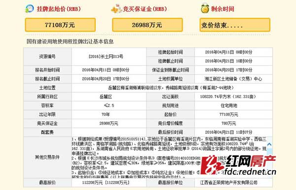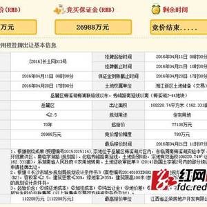 该地块经过正荣、碧桂园、旭辉等4家公司46轮竞价后,今日最终被江西省正荣房地产开发有限公司以11.22亿价格竞得,溢价率高达45.5%,折合楼面价4147.4元/平方米。此外,记者查询到,该宗地的起始价已超过2015年长沙“地王”价格,最终成交的11.22亿元是否能问鼎2016年长沙“地王”,不得而知。