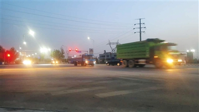 昨日,一辆由南向北行驶的绿色渣土车通过涉事交叉路口。黄灯亮起时抢行,转为红灯时仍未完全通过路口。
