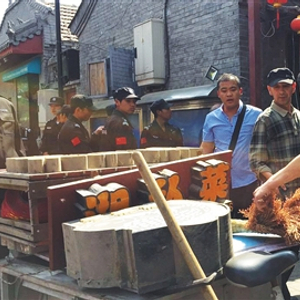 1点半左右,果然有一大队“人马”由南向北清理无照经营商户。记者看到,其中有交道口街道的负责人,也有区工商局、食药监局、消防、属地公安、城管等部门参与。