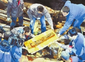 考古工作人员小心翼翼地将一块屏风取出。这是我国迄今为止出土最早的画有圣人孔子像的漆木屏风。