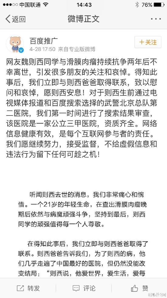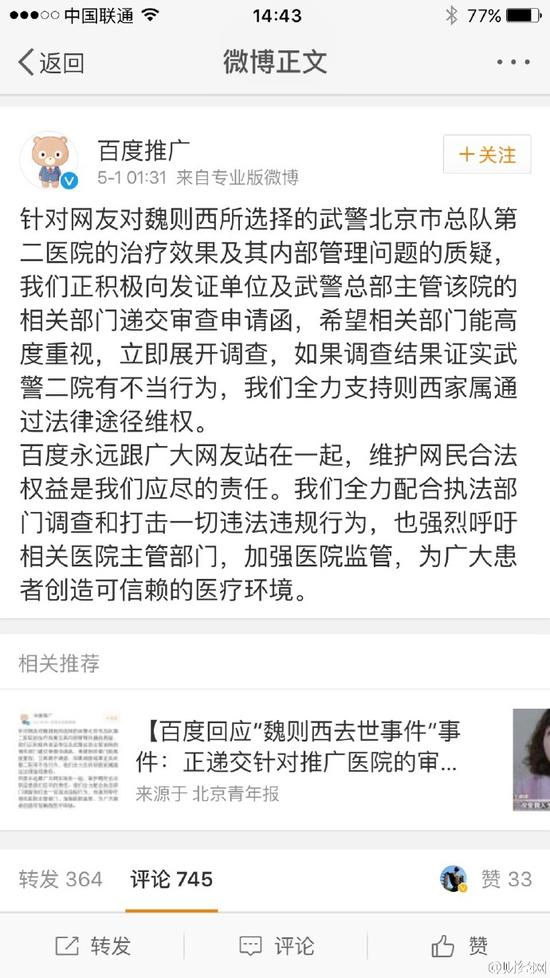 百度推广:针对网友对魏则西所选择的武警北京市总队第二医院的治疗效果及其内部管理问题的质疑,我们正积极向发证单位及武警总部主管该院的相关部门递交审查申请函,希望相关部门能高度重视,立即展开调查,如果调查结果证实武警二院有不当行为,我们全力支持则西家属通过法律途径维权。