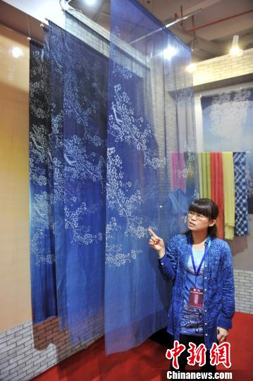 图为汤文君介绍变色梅花蓝染绢丝作品。 吕明 摄