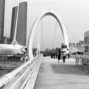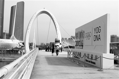 晨报讯(记者 倪敏)五一刚过,到南京国际青年文化公园游览的市民发现,南京眼步行桥桥面正中的雕塑“换人”了。青奥会吉祥物砳砳还在,中心雕塑由五环变成了青奥会会徽。