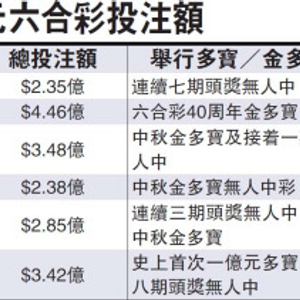 此次“超级六合彩”创下2011年5月以来,亿元多宝投注额的新低纪录,总投注额只有2.35亿元。投注情况远逊3月的“40周年金多宝”,当时总投注额达到4.46亿元。