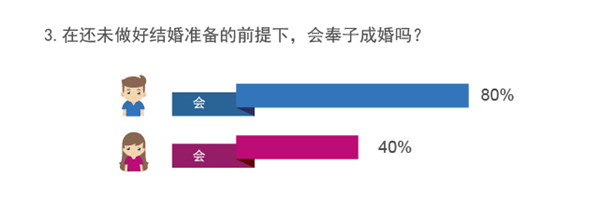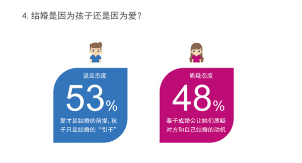当女人的肚子里一个新生命开始孕育的时候,是否结婚就成了当务之急?对于奉子成婚,单身男女的态度截然不同。据珍爱网调研数据显示,在还未做好结婚准备的前提下,近八成单身男性表示会因为孩子而结婚,但将近六成单身女性表示不会因为孩子去结婚。可见孩子并不会让女性对婚姻产生安全感,近五成女性表示,奉子成婚会让她们质疑对方和自己结婚的动机,疑惑对方到底是因为爱情还是因为孩子而结婚。相反,单身男性对奉子成婚会表现出担当和责任感,超五成男性认为爱才是结婚的前提,孩子只是结婚的“引子”。