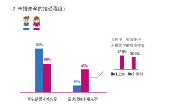 如今是一个性开放的时代,大家对于婚前性行为也更为包容。但热恋中的情侣,不管平时如何小心谨慎,也会发生老马失蹄的情况,未婚先孕的现象越来越常见。据珍爱网调研数据显示,近九成单身男女表示身边有未婚先孕的例子,可见未婚先孕是普遍存在的。但对于未婚先孕的态度,单身男女的观点却大相径庭。85.66%单身男性接受未婚先孕,而44.68%单身女性却完全不接受,32.45%的单身女性表示会采取避孕措施预防怀孕。同时,可以发现,在拒绝未婚先孕的单身女性中,深圳和上海这两个一线城市所占比例同样很高,有38.9%的深圳单身女性表示完全不接受未婚先孕,上海的这一比例则达到了42.9%。这表明虽然一线城市的单身女性婚恋观比较开放,但是在未婚先孕的问题上,女性依然存在着顾虑。
