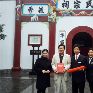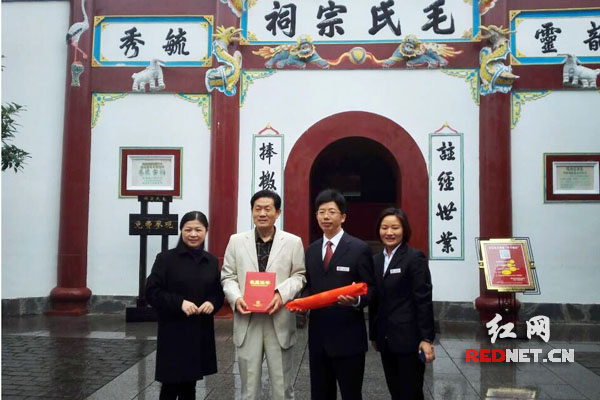 5月9日上午,湖南省政府参事、第六届中国书协理事周用金(左二)应邀为韶山毛氏宗祠捐赠楹联作品。