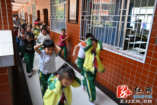 学生们快速有序的撤出教室,并按演练方案规定的疏散路线迅速撤离到操场