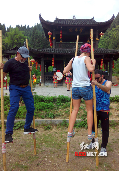 原标题:拉美艺术家游永顺老司城 品“拦门酒”玩“踩高脚”