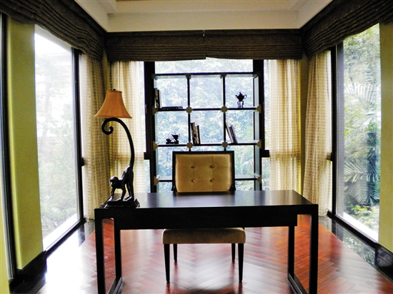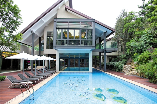 目前开放了两套别墅的样板房,分别为3号楼“紫蝶轩”和21号楼“游意轩”。据称“紫蝶轩”最受客户欢迎,艺术范十足。这栋别墅产权面积约为1060平方米,总价近2亿元。建筑如一个蝶茧,既阻挡外部的干扰,又有精彩的内部环境。其中游泳池围绕一楼的餐厅和卧房而建,长度最长可达50米,相当难得。二楼为主卧、次卧及书房,主卧采用大面积落地玻璃设计,与院子里的参天大树、阳光配合得天衣无缝。经过一段室外走廊后,你会发现一个四面都是玻璃的小房间,这个隐秘且私密的地方就是书房,书房旁边有一段私家小径,主人可趁工作闲暇,走到外面呼吸一下大自然的新鲜空气,感受一下鸟语花香。地下室可建成影音室、酒窖、桑拿房、工人房等,空间多变。