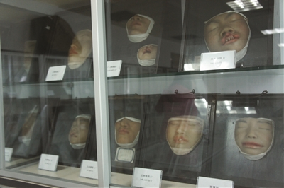 陈列在玻璃柜里的脸部模型。