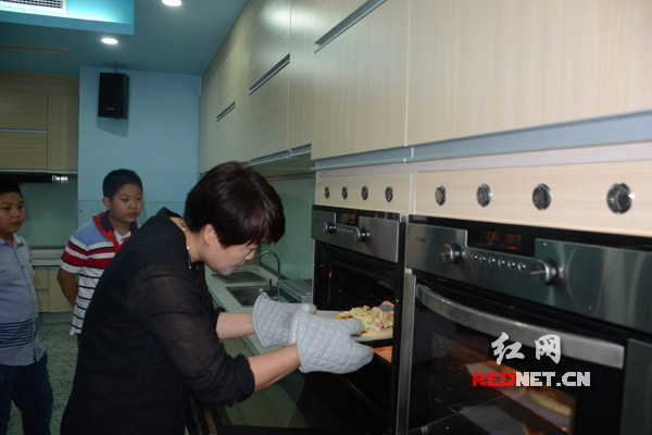 烹饪老师带领学生自制披萨。