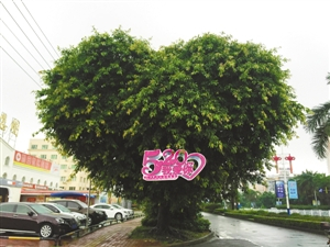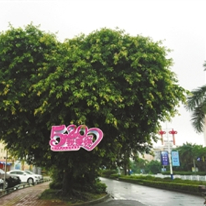 广西北海一棵路树因长相酷似爱心,成为“网红”,吸引了不少民众于“520告白日”当天前来拍照留念,更有部分男女青年在爱心树下表达爱意。北海市城市绿化管理站介绍,这棵树叫做黄葛榕,是自然形成的。该绿化管理站表示不会去刻意修剪这棵树。图为被民众挂上“520我爱你”红色标签的心形大榕树。中新