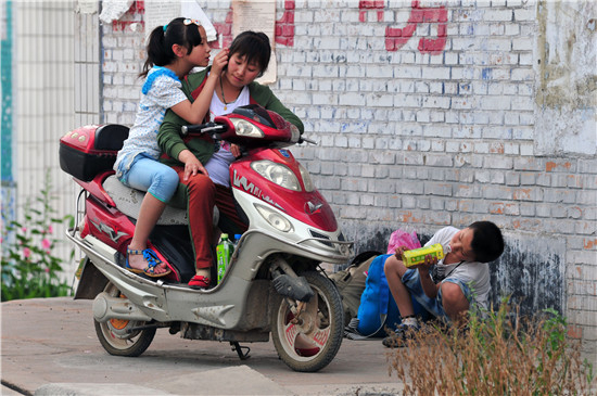 山西省永济市,母子三人正在路边等寄宿学校的校车,到20公里外的县城去上小学。姐姐上六年级,弟弟上二年级,两周回一次家。视觉中国供图(资料图片)