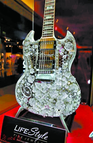 这件钻石吉他由中国香港著名音乐人雷颂德设计,周大福珠宝公司与吉布森吉他公司合作出品,用400克拉钻石和1.6公斤黄金镶嵌打造而成,总价值达200万美元(约合1300万元人民币)。