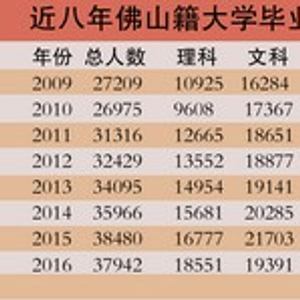 在2009年,佛山文、理科生毕业人数占比约为6:4,其中文科生人数16284人,远远超过理科生的10925人。但是由于佛山的产业是以制造业为主,对于理科生的需求量特别大,因此形成了就业不匹配的结构性矛盾。