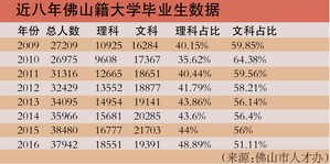实际上,佛山在高校毕业生就业方面长期存在着结构性的矛盾,每年毕业的文科生数量众多,但是理工科生数量却远远不能够满足佛山企业的需要。记者梳理了近8年的数据发现,从今年的文、理科毕业生的人数、占比情况来看,相对来说,文、理科结构性矛盾在一定程度上有所缓解。