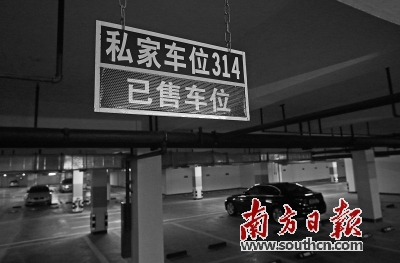 停车高峰时段,珠海某小区停车场内的很多停车位都未停放车辆,车位吊牌显示车位已售出。 王荣 摄