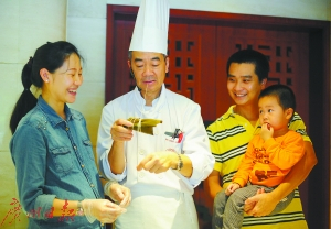 过去端午节来临前,家家户户备好材料,自己动手包粽子。上周六,一场盛大的“包粽子”场面再现中国大酒店。30个家庭参加由广州日报揾食广东与中国大酒店共同举办的端午节亲子活动“五星厨师教你包粽子”,在30分钟内完成两个粽子。有的家庭更是创意无限,将粽子包出新花样来。