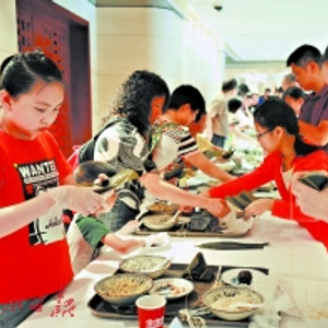 中国大酒店名厨吴炳亮手把手教粉丝包粽子。