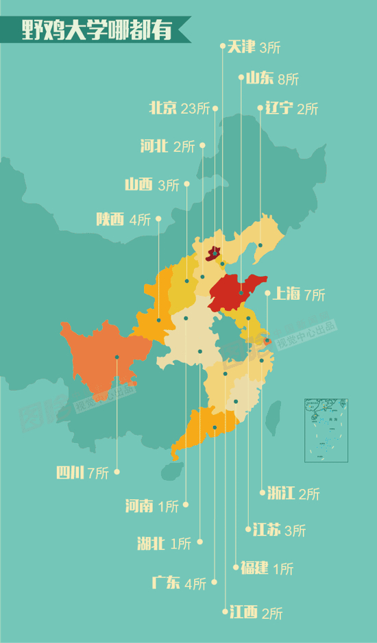 73所“野鸡大学”涉及全国的16个省市,其中北京占近三分之一,达到了23所。山东有8所,上海、四川各有7所。