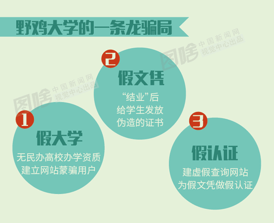 “野鸡大学”的目的就是通过发放伪造文凭向学生收费,为方便行骗,很多虚假大学网站均有虚假的在线学历查询等入口,为假文凭做假认证。