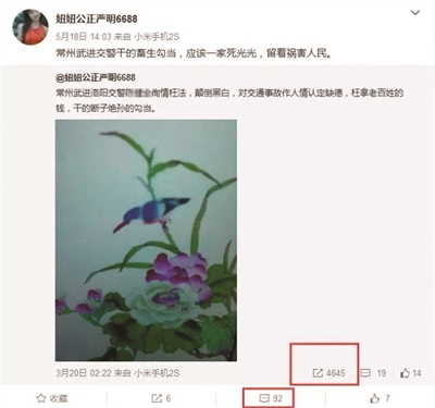 这个充斥着诅咒内容的账号是2015年6月16日注册的,从今年3月20日起,该账号开始不停地转发自己的微博内容,对象直指当事处理事故的民警,进行人身攻击:“徇情枉法,颠倒黑白”“枉拿老百姓的钱,干的断子绝孙的勾当。”以及“常州武进交警干的畜生勾当,应该一家死光光,留着祸害人民。”等辱骂性的言语,并鼓动关注的人转发。