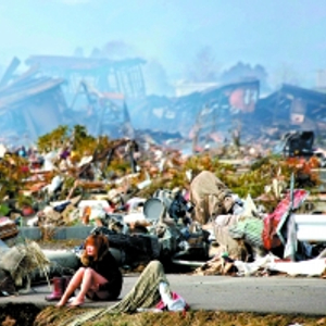 当地时间2011年3月13日,日本名取市,一名妇女坐在废墟上哭泣。