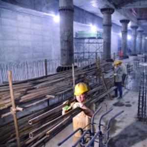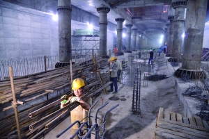 昨日上午,在廖公庄站施工现场,工人们正在站台层进行施工。