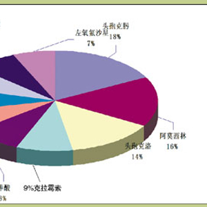 叶枫介绍,我国排名前十位的抗菌药物分别为头孢克肟、阿莫西林、头孢克洛、克拉霉素、棒酸、左氧氟沙星、罗红霉素、阿奇霉素、头孢地尼、头孢丙烯。其中,三代头孢菌素头孢克肟是使用量第1位的抗菌药物,占18%;喹诺酮类使用最多是左氧氟沙星,占7%(详见上图)。