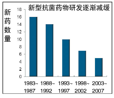“现在,新型抗菌药物的研发逐渐减缓,未来真的可能面临无药可用的局面。”叶枫说,细菌产生耐药性的速度远远快于新抗生素研发的速度。随着细菌耐药性的增长,有效抗生素的数量逐渐减少。正如2011年以“抗生素耐药性”为主题的WHO世界卫生日提出的:今天不采取行动,明天就无药可用。