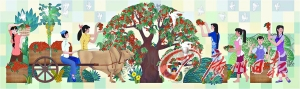 11号线南山站的艺术墙名为《南山红》,作品选取了岭南佳果荔枝作为主题,描绘了仲夏时节荔枝丰收的场景,烘托出深圳人红红火火的生活期待。
