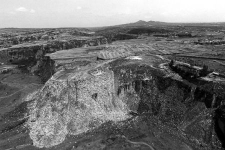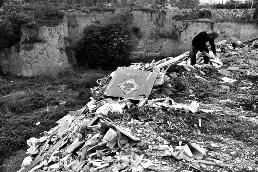 “山”高七八十米,宽约二三百米,从空中俯瞰,犹如一条灰色的巨舌,正肆无忌惮地伸进河谷,舔噬着原本属于这里的一片绿色。在它周围,没有树木,也鲜有杂草,只有弥漫的臭气、飞舞的垃圾袋,以及无数蚊蝇在空中纷飞滋扰。