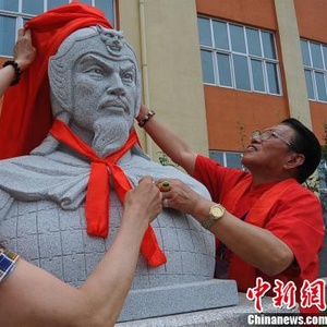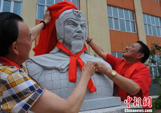 图为廊坊市首届杨家将文化旅游节上,宋辽史学家及海内外杨氏宗亲为杨家将塑像揭幕。 金志超 摄