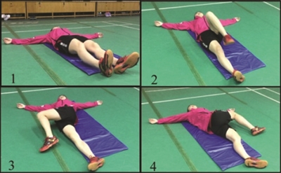 提示:坐姿,一侧膝关节向后屈曲,双手向下撑地,上身向后慢慢倾斜,逐渐拉伸大腿前侧肌肉。