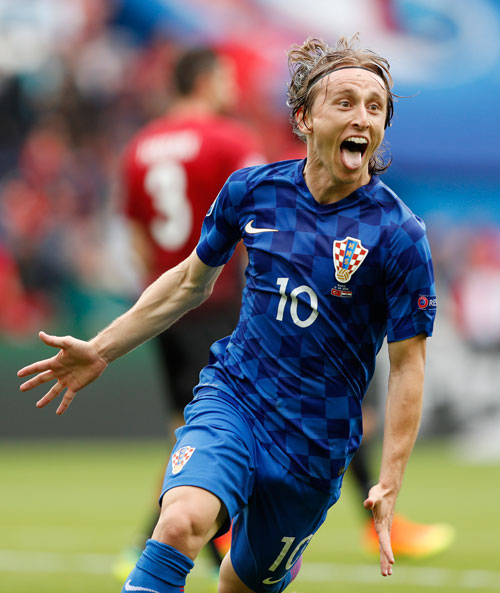 6月12日,在欧洲杯D组一场较量中,克罗地亚队中场核心莫德里奇庆祝打出世界波。视觉中国供图