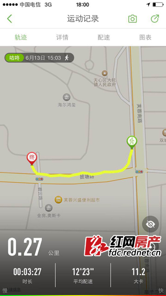 本次活动使用手机软件进行丈量,图示为从大托站步行至海尔鸿玺。