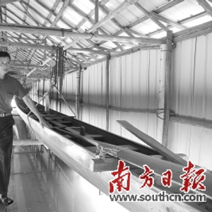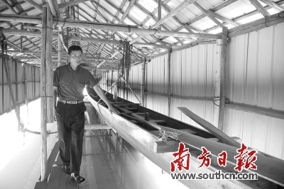 今年58岁的何满成,是泥洲村的龙舟管理员,有8年龙舟保养经验。记者跟随成叔走进泥洲村的“龙棚”。成叔介绍,“龙棚”长约60米、宽6米,可存放2条传统龙船和2条标准龙船,属于比较大的龙船棚。