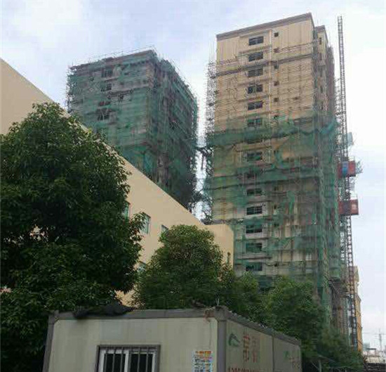 6月8日,记者在村民的指点下来到了长乐市江田镇友爱村的大街,两座17层的高楼显得鹤立鸡群,十分醒目。两座高楼相距15米左右,三层以下是联体的,占地约两亩。高楼的主体已接近完工,升降机上下运载作业,一楼有部分工人在做泥水活。