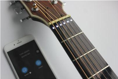 “游戏”中需要使用GEEK吉他是通过蓝牙连接手机上app——弹琴吧。在完成连接后,在手机端选择任意曲谱,吉他指板上的led灯光会同步显示每一个和弦或指法。让学习吉他的童鞋体验游戏般的乐趣。