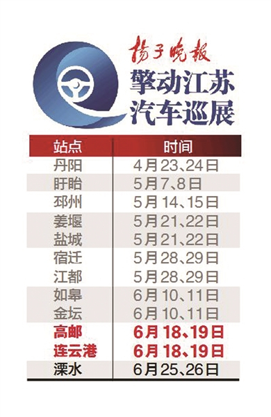 明后两天,由新华报业传媒集团主办,扬子晚报承办的“擎动江苏”12城汽车巡展将继续在连云港和高邮同时上演“双城车事“。近20家汽车厂家携100多款新车将为两地购车人带去“年中抄底价”盛宴,数款畅销车型的优惠幅度超万元。