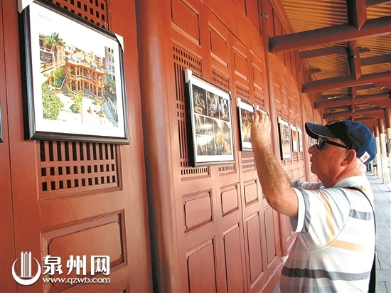 泉州府文庙是全国重点文物保护单位,是集宋、元、明、清四朝代建筑形式的孔庙建筑群。历史悠久,规模宏大,布局匀称,建筑优美,造型独特,规制完整,文化内涵丰厚,是宋代中原文化和闽南古建筑艺术的有机结合。导游用英语讲解时,欧美游客赞不绝口。其间,府文庙举行的图片展吸引了这些老外驻足观赏,并纷纷拍摄留念。