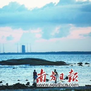 21日傍晚,在文昌石头公园,几名游客一边踏着雪白的浪花,一边远眺不远处的文昌航天发射场。