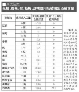 最有趣的是,榴莲食用后测试结果居然是0,看来不一定气味冲天的食品就会被测有酒精含量。风油精在嘴里的味道实在不好受,但其测试结果也为0。葡萄最重要的一个功能就是酿酒,可新鲜葡萄食用后并未检测出酒精含量。倒是甜甜的荔枝、又糯又甜的香蕉、脆甜的梨、酸甜的杨梅,还有甜桃,食用后反而会被测出酒精含量。