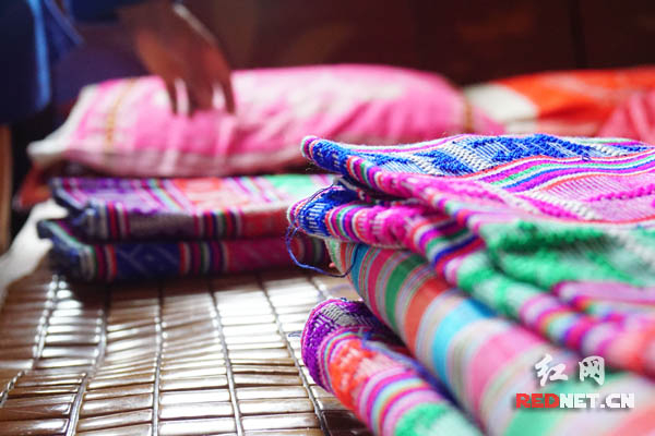 除了制作瑶衣,织锦技术也是每个井头湾村妇女的必备技能。村支书蒋团城介绍,每年11月是村里最具特色的盛大节日,全村的妇女要进行一场别开生面的织锦比赛,各种花色、式样的织锦都将出现在比赛上,“八宝被”、围裙带、腰带、背带,妇女们会为夺得头彩拿出看家本领。