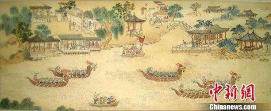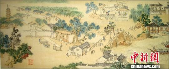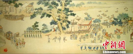 据其介绍,《水乡古镇蚕花节》再现的是“丝绸之府”湖州当地的民俗风情、人文古迹,以南浔百间楼为起点,徐徐展开张静江故居、张石铭故居、嘉业堂藏书楼……画卷行至中间,只见锣鼓喧天、彩球纷飞、上下人流如织,洋溢着一片喜庆。这是当地清明“轧蚕花”时举行的祭蚕神活动,它包括蚕花舞、背蚕娘、划菱桶比赛等一系列文化活动,画卷将“蚕花节”这一每年清明时节湖州蚕农祈求蚕茧丰收的特有民俗表现得惟妙惟肖。